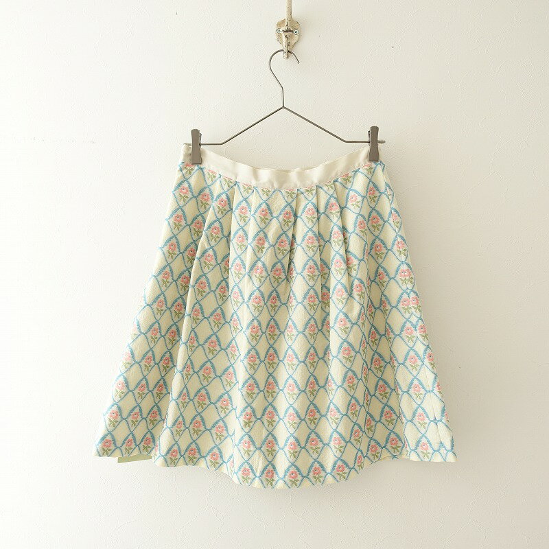 表記サイズ:F 実寸サイズ:ウエスト幅36cm, ヒップ幅47cm, 着丈52cm (多少の誤差はご了承ください) 素材:コットン85%,ポリエステル15% 別布-コットン100% 裏地-ポリエステル100% デザイン:nesessaireのフラワージャガードタックフレアスカートです。