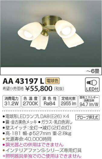 カテゴリ:照明器具 インテリアファン メーカー:コイズミ照明 koizumi 型番:aa43197l ◎照明関連 【おすすめ Fケーブル】 (※適合に関しては事前にご確認ください) VVF1.6x2C VVF2.0x2C VVF1.6x3C VVF2.0x3C