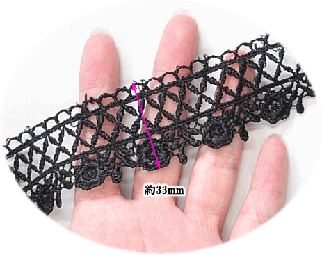 ポリエステル ケミカルレース 約33mm幅 7.5Y(約6.5m) 《 ブラック 黒 レース モチーフ 花 洋服 バッグ インテリア カルトナージュ 飾り アクセント クラフト ハンドメイド 手芸 手作り 》