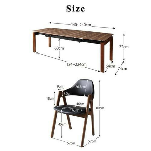 北欧テイスト 天然木ウォールナット材 伸縮ダイニングセット■テーブル(W140-240)【サイズ】幅140-240 奥行90 高さ72cm【材質】 天板:天然木化粧板(ウォールナット) 仕上げ:ウレタン塗装 枠/脚部:スチール/天然木(ラバーウッド)【製品重量】77kg【梱包数】2【梱包サイズ/重量】 天板:142 95 18cm/65kg 脚部:82 73 19cm/16kg【生産国】ベトナムまたは中国 ※組立品■チェア(2脚組) 【サイズ】幅52 奥行57 高さ80(座面高45)cm【材質】 フレーム:天然木(アッシュ) 張地:合成皮革(PVC) クッション材:ウレタンフォーム【カラー】ブラック/ホワイト【製品重量】6kg(1脚)【梱包数】1(2脚1梱包)【梱包サイズ/重量】71 57 110cm/13kg【生産国】ベトナム※完成品■ベンチ【サイズ】幅100 奥行40 高さ45cm【材質】 フレーム:天然木(アッシュ) 張地:合成皮革(PVC) クッション材:ウレタンフォーム【カラー】ブラック/ホワイト 【製品重量】8kg【梱包数】1【梱包サイズ/重量】103 43 50cm/9.5kg【生産国】ベトナム※完成品■4点セット【セット内容】テーブル、チェア 2、ベンチ 1■5点セット【セット内容】テーブル、チェア 4■6点セット【セット内容】テーブル、チェア 4、ベンチ 1■7点セット【セット内容】テーブル、チェア 6■8点セット【セット内容】テーブル、チェア 6、ベンチ 1■9点セット【セット内容】テーブル、チェア 8※サイズ・重量は概算です。